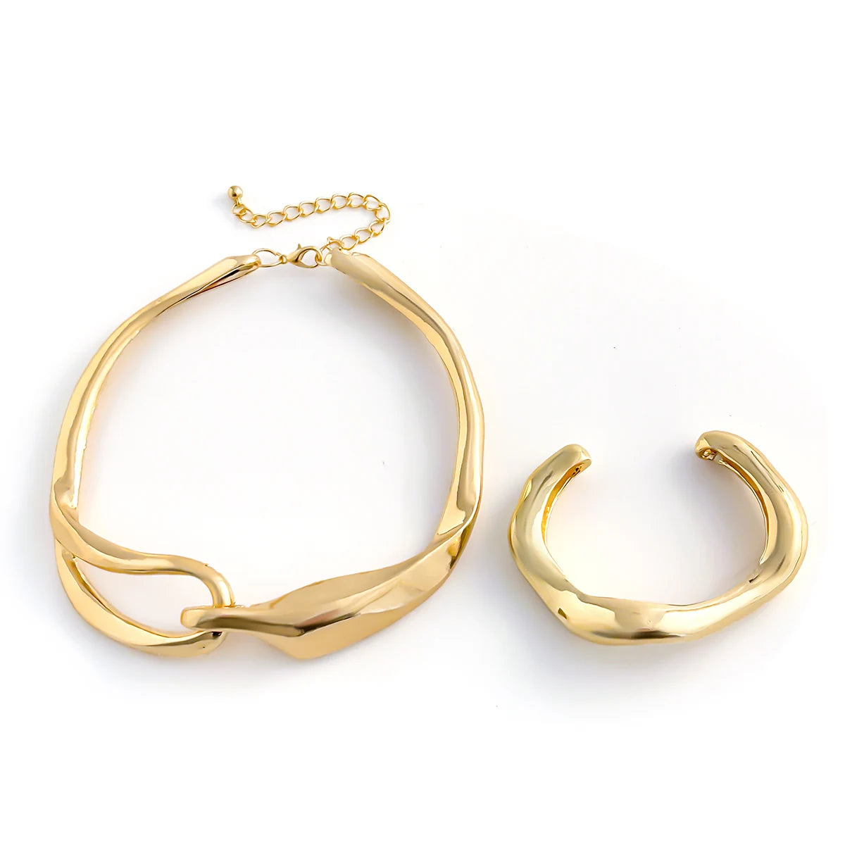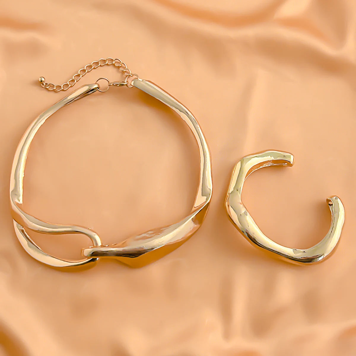 Inspired by Aurora, the Roman goddess of dawn who brought light to each new day, this sculpted necklace and cuff embody renewal, fluid beauty, and unstoppable feminine strength. Crafted for women who rise and shine on their own terms.