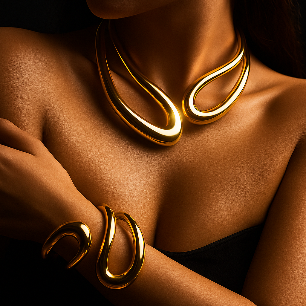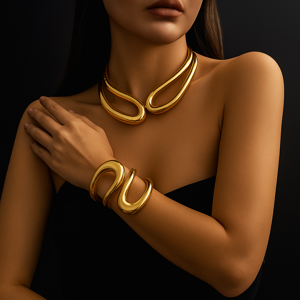 Inspired by Parisian avant-garde sculpture, this set transforms fluid motion into wearable art. Each curve is a bold statement of modern luxury, designed to command attention.