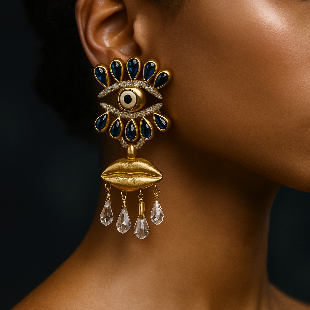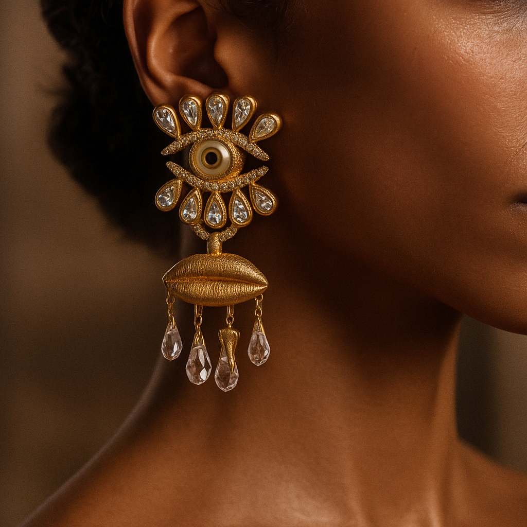 Inspired by the ancient Eye of Horus, a sacred Egyptian amulet of power and divine protection, this masterpiece is forged in 18k gold and adorned with rare crystals cut from the hidden highlands of Nepal. Every stone reflects the balance of vision and strength once believed to guard pharaohs and queens.