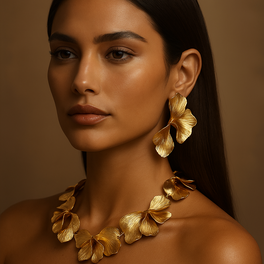 Handcrafted in 18k gold-plated brass, each sculpted petal captures the fleeting beauty of a blooming garden at golden hour. A wearable work of art, it drapes the neckline in nature’s most opulent form, radiating rarefied allure.