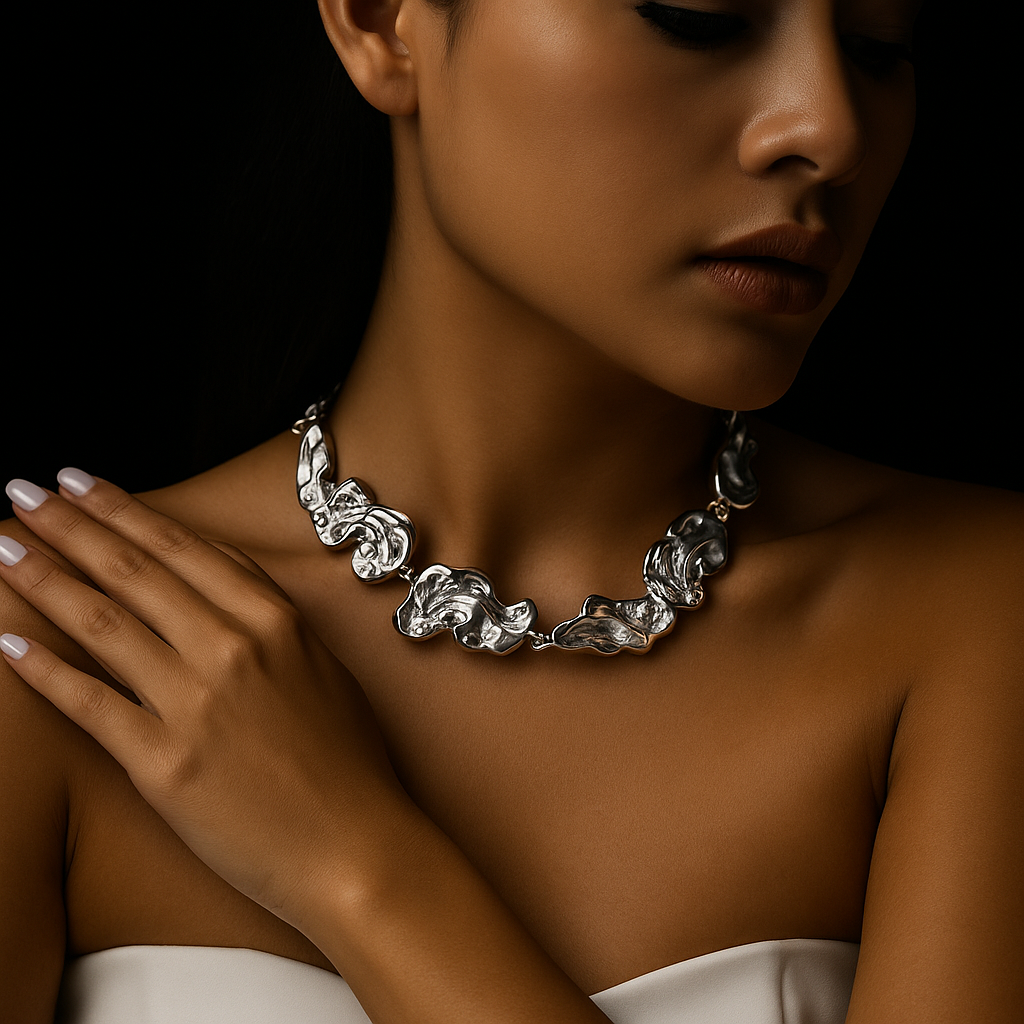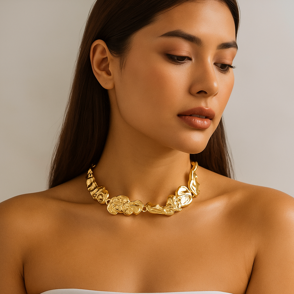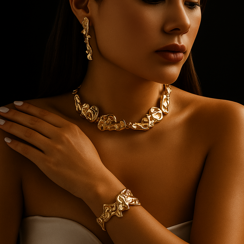 Inspired by the flowing sculptures of Italian masters, this set is handcrafted in 18k gold plating over premium fine metal, designed to look like molten gold frozen in motion. Each piece carries the aura of wearable art, turning your presence into a statement of rarity and prestige.