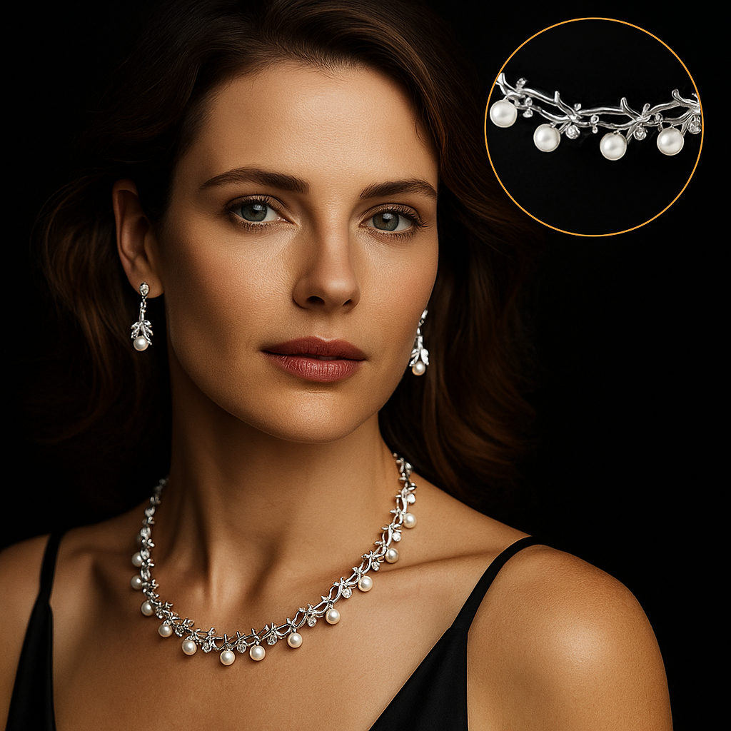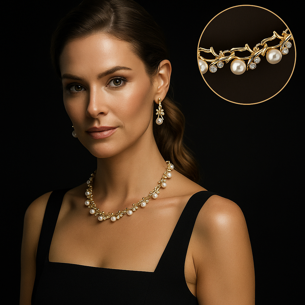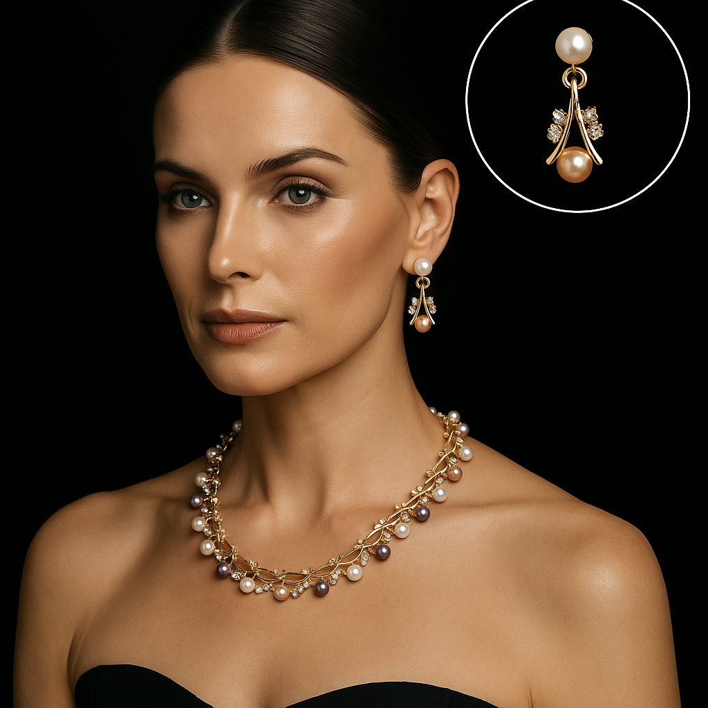 Crafted with luminous, hand-selected Akoya pearls from Japan, this set radiates timeless elegance with every movement. Each pearl is individually mounted on a luxurious 24K gold chain, creating a rich, refined glow that elevates any look.