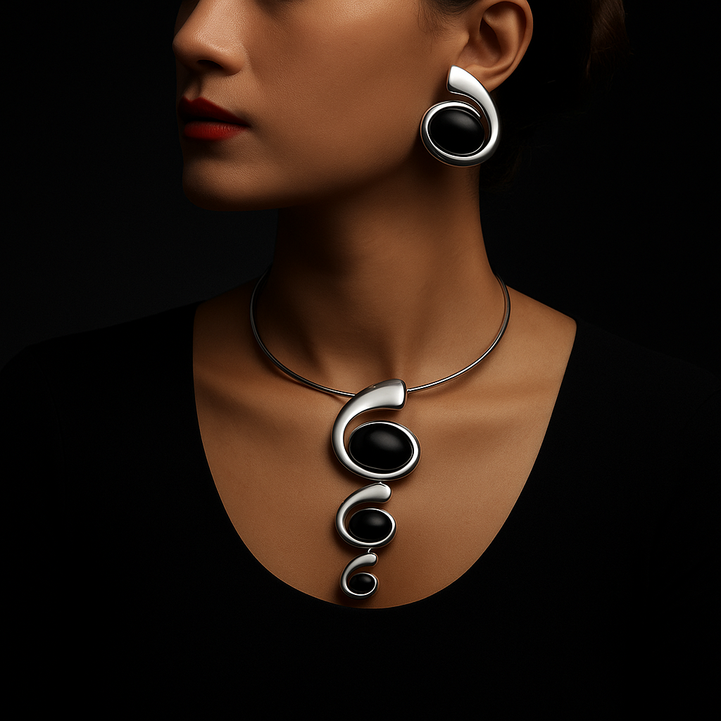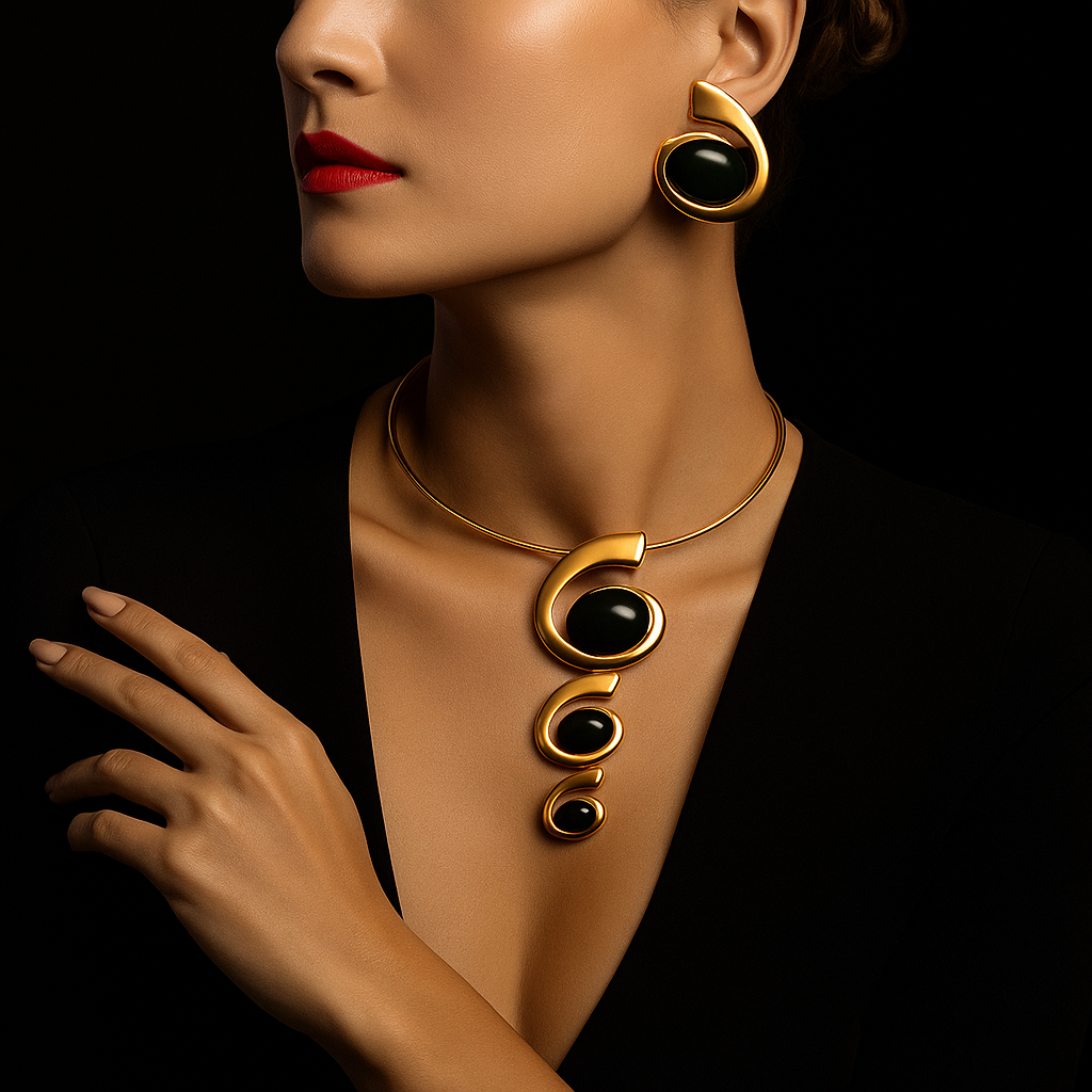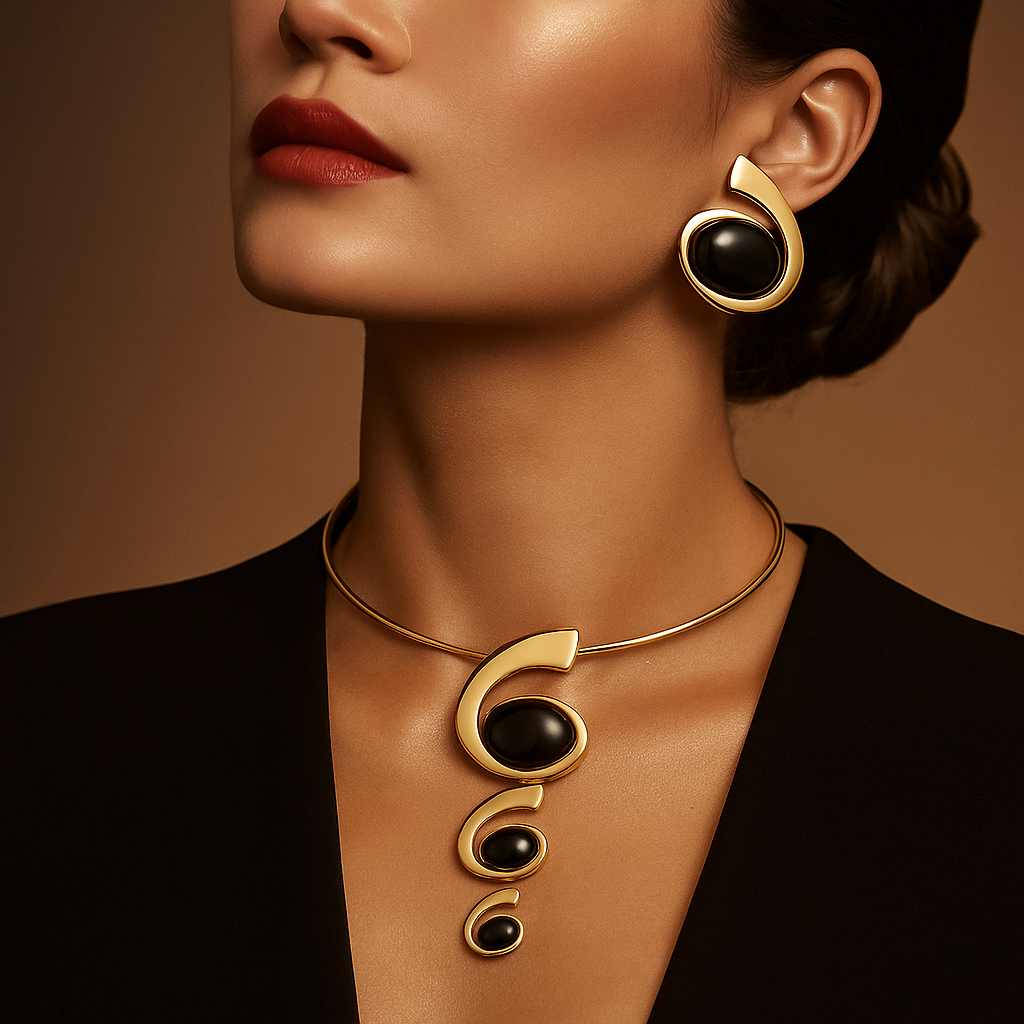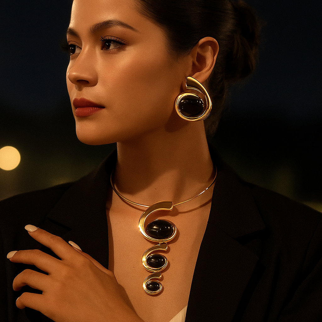 Handcrafted with 18k gold plating and fine silver alloy, this statement necklace is crowned with rare black gemstones sourced from the hidden highlands of Nepal, revered as nature’s secret treasure. A design that cascades with celestial allure, it transforms every moment into a portrait of power and refinement.